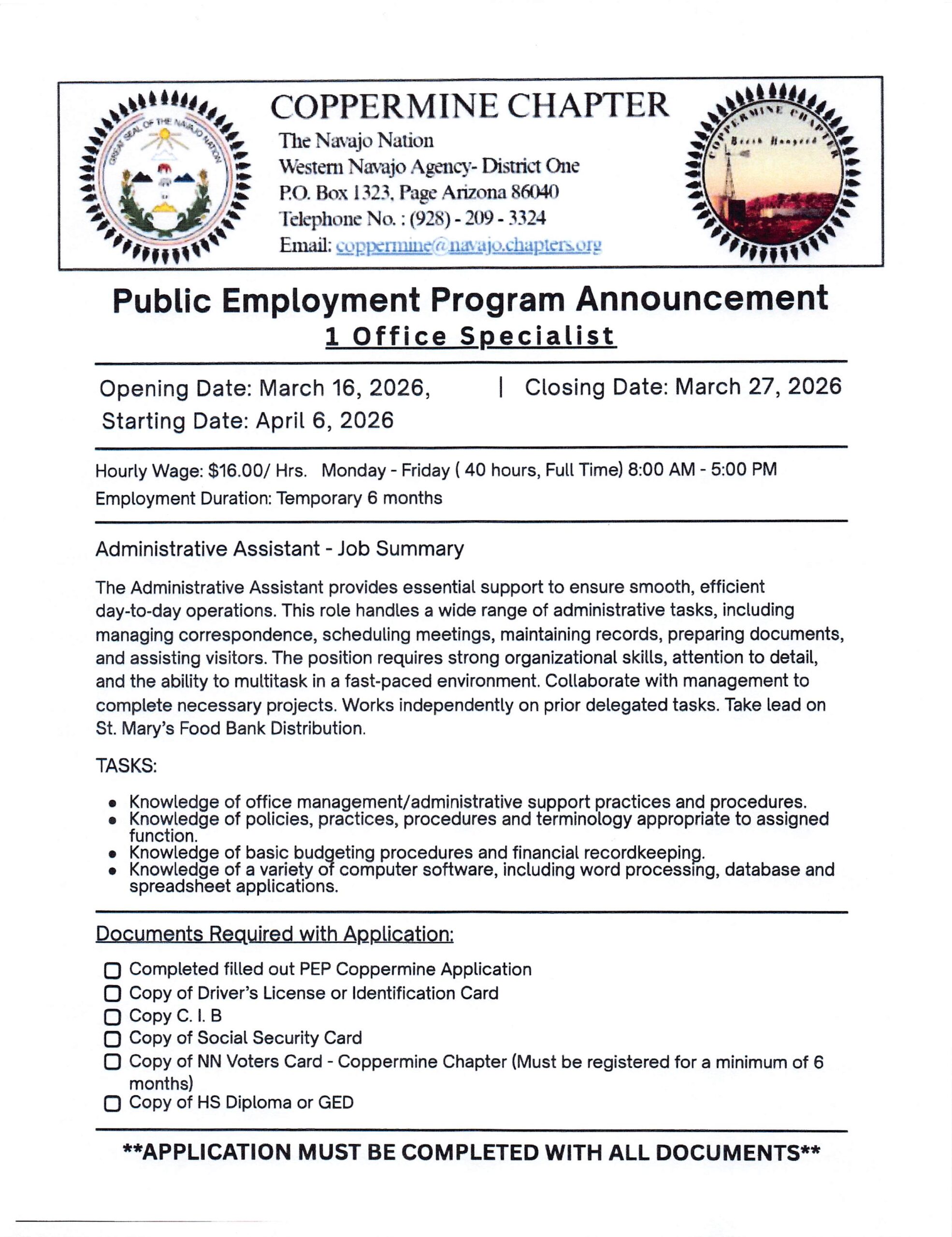 Employment CHAPTER 11242025 PEP Electrician 11242025_PEP Equipment Oper OS Flyer WaterResource, ChptrWaterLineProj Laborer Dept.WaterResource/ChptrWaterLiNprojOperator 1. Chapter Youth Employment a. Youth Employment Policy b. Youth Employment Application 2. Application for Chapter Public Employment Program Has to be complete, not piecemeal. 3. Navajo nation workforce development You have a CIB? Navajo Department of Workforce has funding to send you to training. Usually covers tuition, room and board, and stipend for attending training. (Blue collar/White collar/ etc..) OTHER LOCATIONS 1. Navajo Judicial Branch Traditional Program Specialist [Job Description Here] [APPLY HERE]*click* 2. Navajo Nation DPM 3. State of Arizona 4. Dine' College 5. Coconino county 6. Ntua 7. Indian Health Services 8. Navajo Judicial Branch 9. NECA 10. Tuba City Regional Health Care Corp. 11. SRP 12. ARAMARK 13. NAU 14. Page Unified School District 15. USA JOBS 16. NHA Scattered Home Projects CONTRACTORS: i. LamCorpJob Construction Laborer (Navajo Nation) Electrical Helper (Kayenta/Chinle) Electrician (Kayenta/Chinle) Screenshot 2025-02-12 162303 Screenshot 2025-02-20 094816 Screenshot 2025-02-27 135340 Plumbers Needed Locally ⚒️ Training / apprenticeships 🥽 1. Navajo Nation Department of Workforce Learn a new job skill for income.🫰🏾💵 2. Arizona Work Training Programs 3. Phoenix Job Corp 4. CDL Training Heavy Equipment Operator, SJ College WelderHappyGIF 💻 Entrepreneurs 👔 1. Navajo Division of Economic Development a. RBDO 2025 3rd Qtr. Report 2. Start Your Own Business